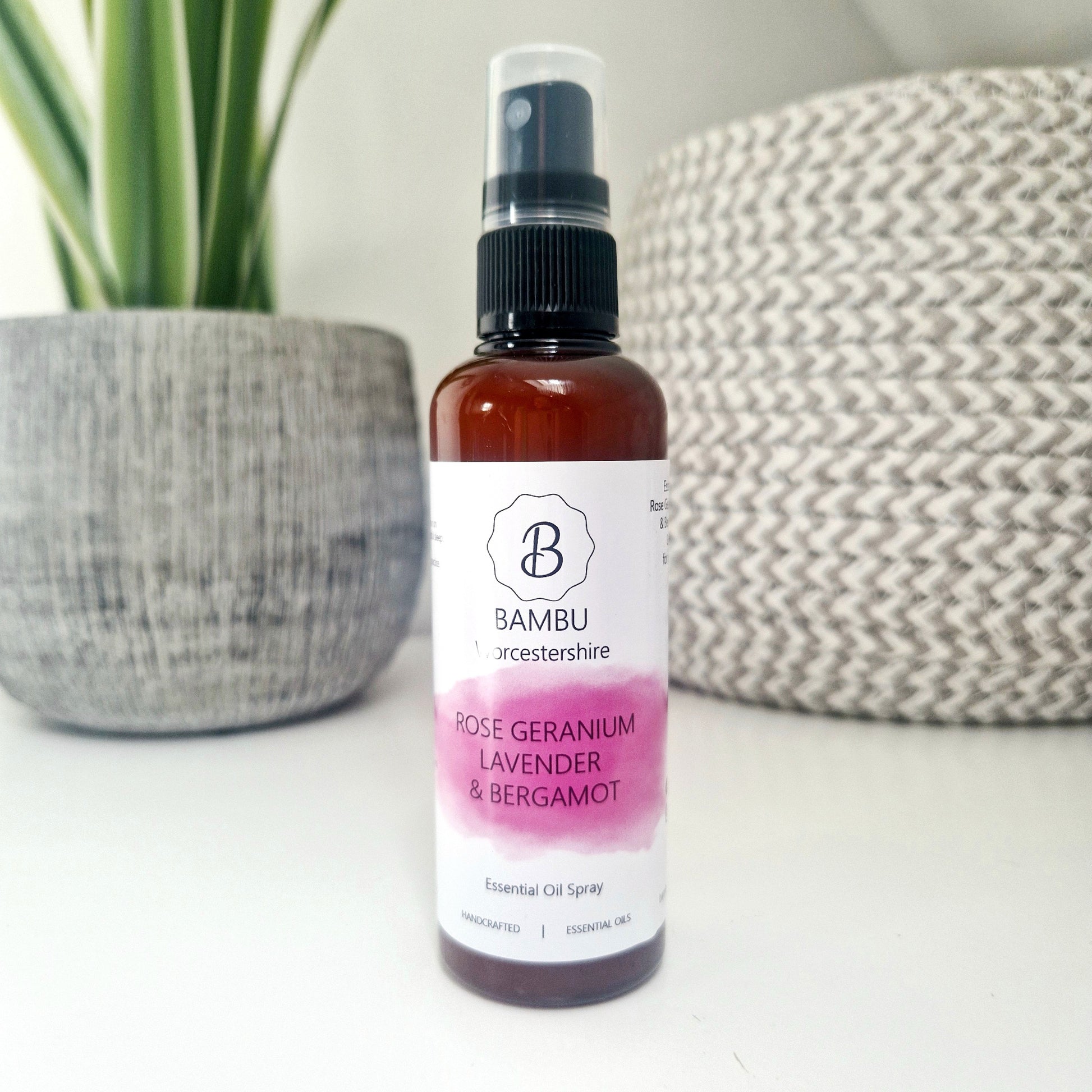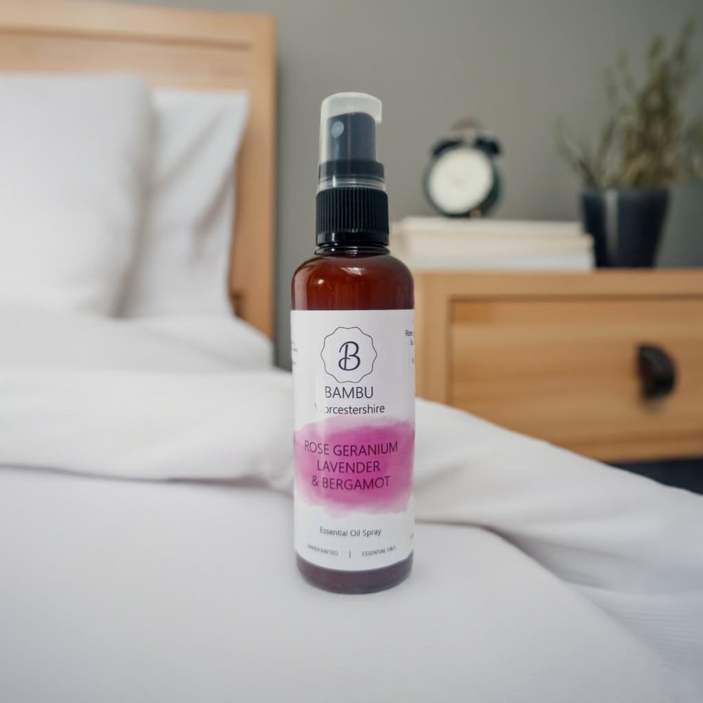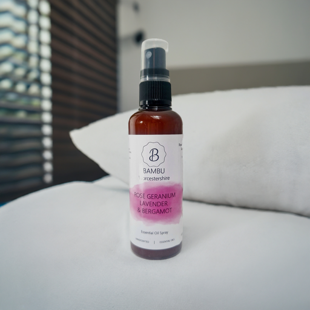 Our essential oil Pillow Sprays are hand blended , labelled exclusively at Bambu Worcestershire.