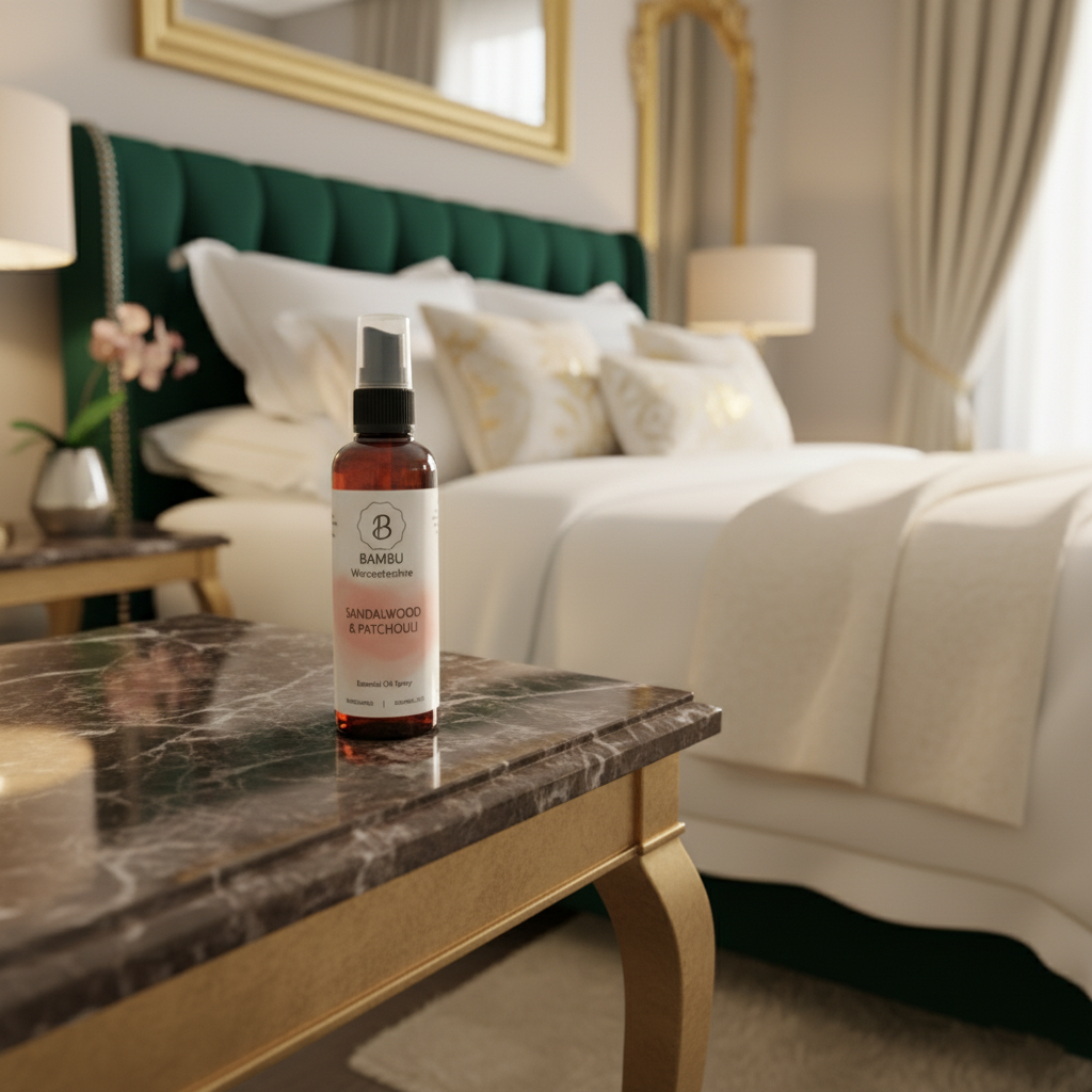 Our essential oil sprays are hand blended and labelled exclusively at Bambu Worcestershire.